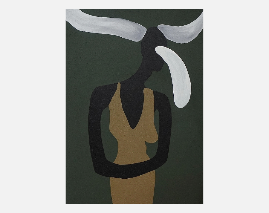Nigerian scholar Nkiru Nzegwu writes that African visual traditions “do not conceive of beauty as surface, but as a moral and cosmological order made visible through the human form.” In her analysis of Igbo aesthetics, the female figure is an archive of communal values which include beauty, fertility, continuity and balance. The women in these paintings exist in that same tradition: not as objects of gaze, but as mediators between seen and unseen worlds. Horns emerge from their heads, not as ornaments but as ancestral extensions of will. In Igbo philosophy, the ikenga which is a human figure with horns embodies - power, persistence, and divine favour. In these paintings, horns crown the feminine not to masculinise it, but to amplify it; they become conduits for intuition and spiritual strength. The woman, as caretaker and mother, is transfigured into a cosmic matriarch, earthly yet celestial, grounded yet ascendant.